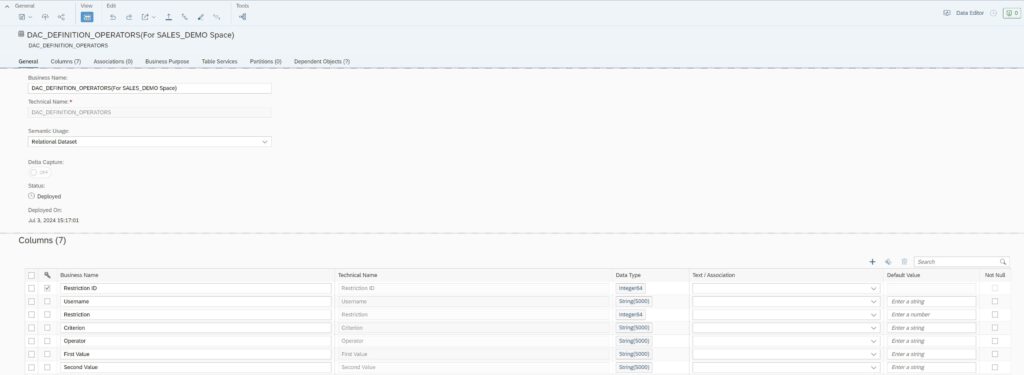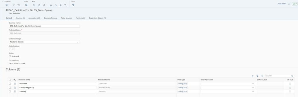 In the middle you see the folder structure we created (Authorizations\Sales_Demo_Space) to know that the tables are used in the sales demo space. They could be used for other spaces as well but depending on the DAC Type the fields to be protected need to be in the target view (e.g. Salesorg does only make sense for a datamodel where it’s contained).
