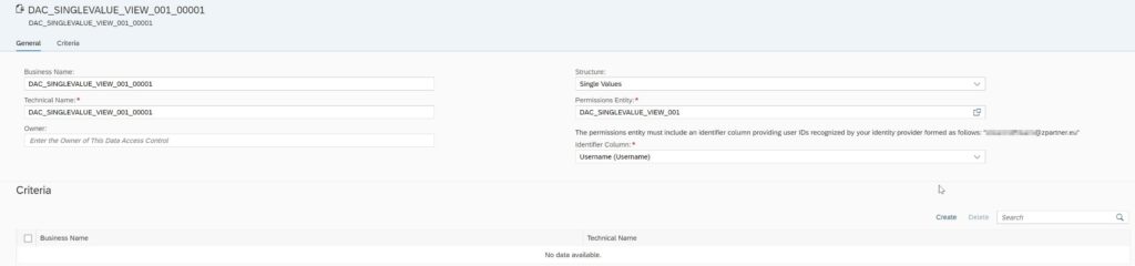We select the same business and technical name: DAC_OPERATORS_VIEW_001_00001 and for the permissions entry we select the view we just created (not shown in this blog): “DAC_OPERATORS_VIEW_001”.