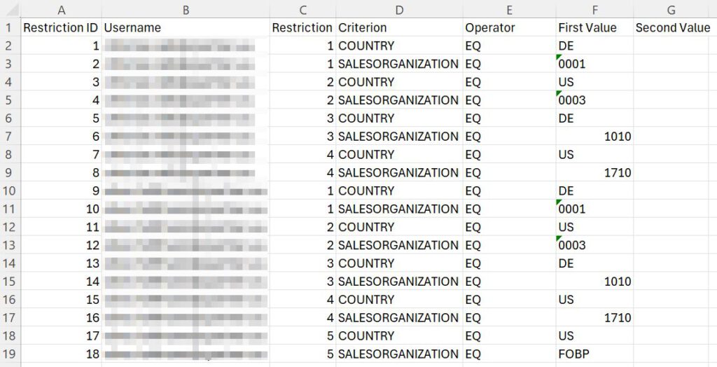 This file should give the users the exact same rights as in the single value example for the first user (Restriction IDs 1-8), plus we additionally added the combination of Country=US and Salesorg = FOBP for the second user (Restriction IDs 9-18).