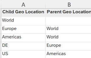 We prepare an Excel file which looks like this the one below and save it as a .csv file, so we can upload it to datasphere to serve as hierarchy for our DAC.