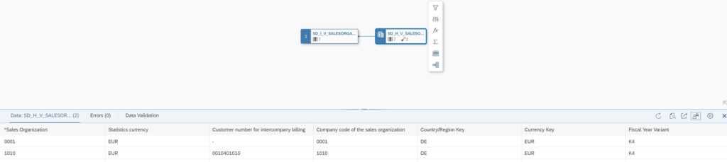 If you compare that to the content of the (unprotected) view shown earlier, and here once again for comparison, you will notice that the two Sales Organizations FOBP & FORP are not shown in the protected view (because they were not part of the .csv we uploaded).