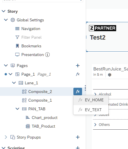 In our story, we focus on using composites for creating a consistent and flexible header across different stories and reports. This header includes a logo, some text, and a home button. The beauty of using a composite lies in its capability to use interfaces—properties, functions, and events—that enable modifications and interactions with different story pages.