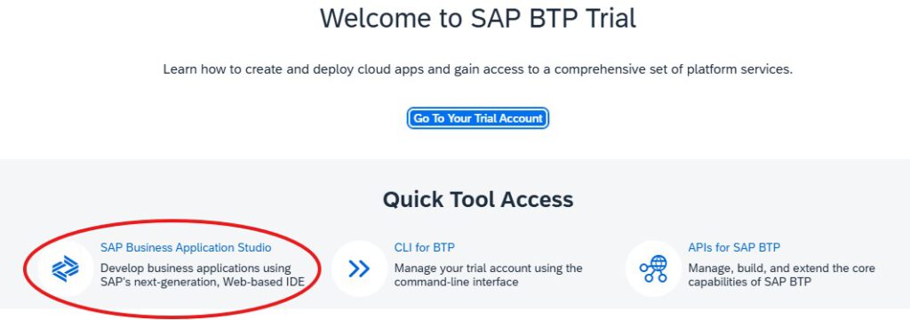 First, login to your SAP BTP account, and navigate to the SAP Business Application Studio.