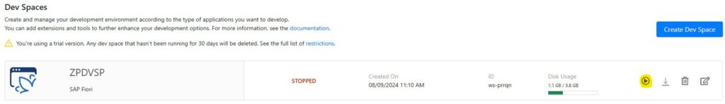 There you need to create a developer space, which is a virtual workspace that provides a pre-configured environment tailored to specific development scenarios. It includes all necessary tools, services, and runtimes required for the development of UI5 applications and more. You can run and stop the space, whereby it’s recommended to stop it when it’s not in use to save resources.