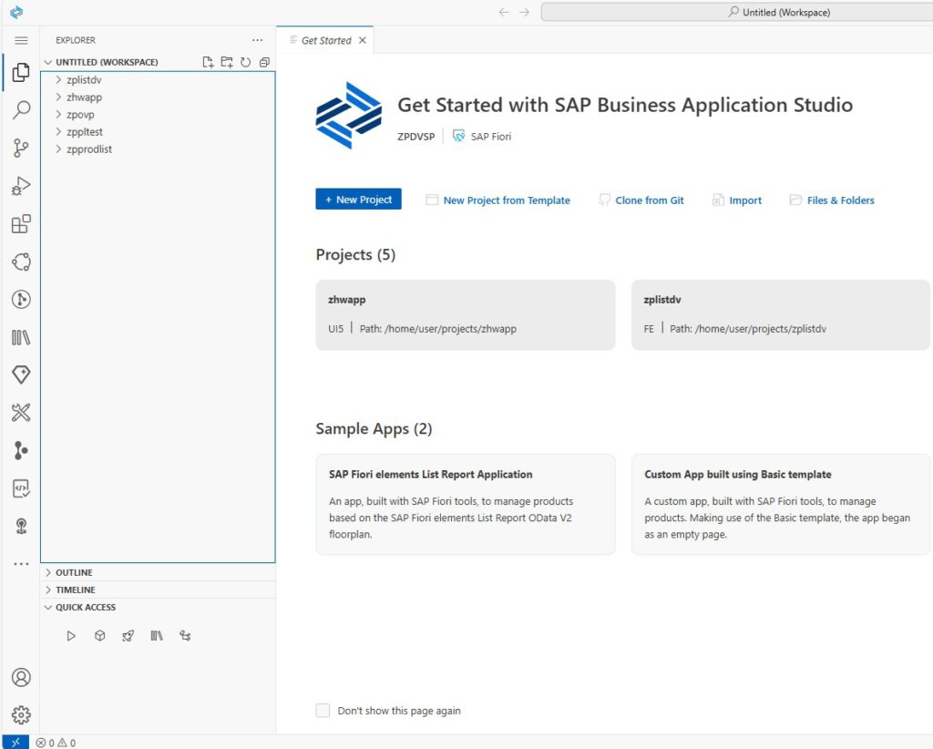 After clicking on the developer space, the BAS opens. The SAP Business Application Studio is a cloud-based development environment designed for building business applications, such as UI5, using a range of tools, templates, and extensions. It allows developers to create, test, and deploy applications in a customizable workspace.