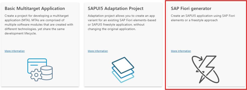 In order to create our first Fiori app we must create a project. Please click “New Project from Template” and select “SAP Fiori Generator”: