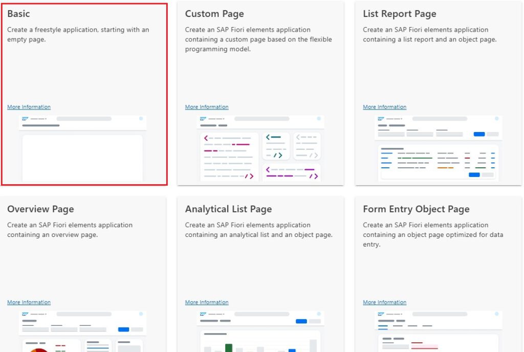 You can choose out of various templates, most of them delivered by Fiori Elements, which support you with the creation of powerful Fiori applications. We will not start with one of those which already provide a specific application structure, but use the basic one for the creation of a freestyle application: