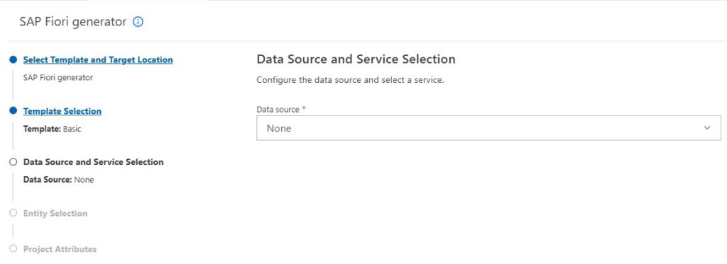 Then we have to define some of the projects parameters and attributes. Since we do not plan to consume live data from our On-Premise system in our first application, we will not choose a data source for now: