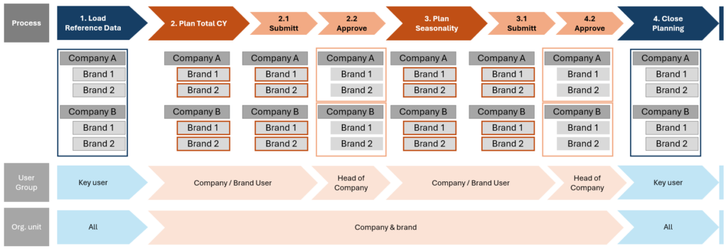 The following process shows a basic sales planning process by company. Each company is planning a quantity key figure by brand. Each brand can be planned by a different user (brand responsible person). Before the planning starts, a key user will provide reference data (e.g. actuals). After a company finishes planning, an approver needs to review the entered data. After the approval, the data should be locked. First, the total calendar year values will be planned. After approval, the values will be planned by month.