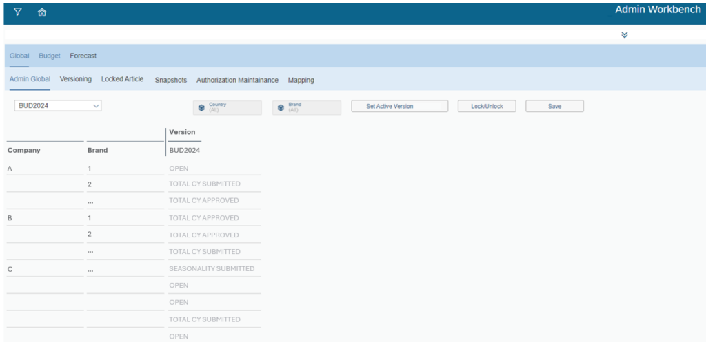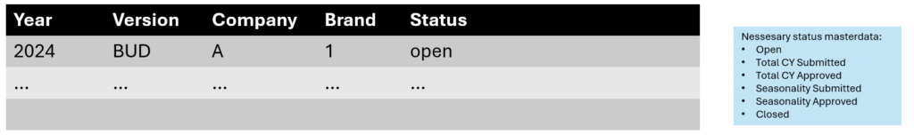 Usage of status: The status in this example can be used to track the progress and submit/approve data, as well as lock data. Therefore, we need to implement additional “locking logic”. A key user can always enter data, besides the status is “closed”. A Company-Brand user can only enter data if the status is “open”. An Approver-User can only edit data if the Status is “submitted”.