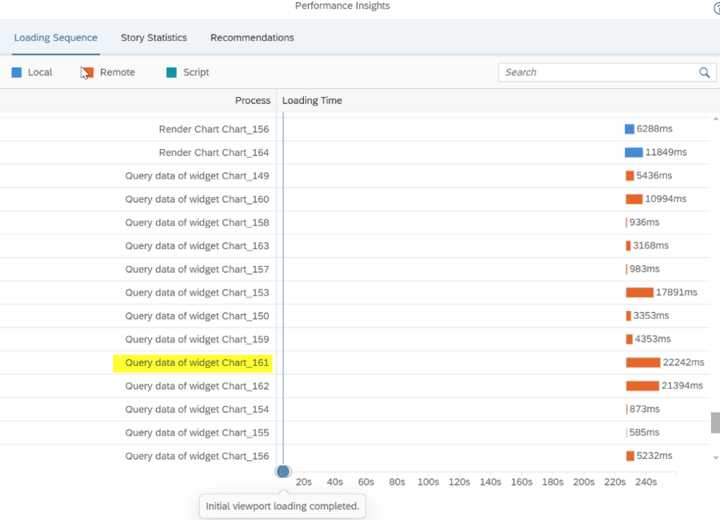 In general, this tool is very useful to pinpoint pages and their widgets (charts, tables, images) which impact the performance of a story. Now the responsible user can re-work the story or go deeper into a backend analysis.