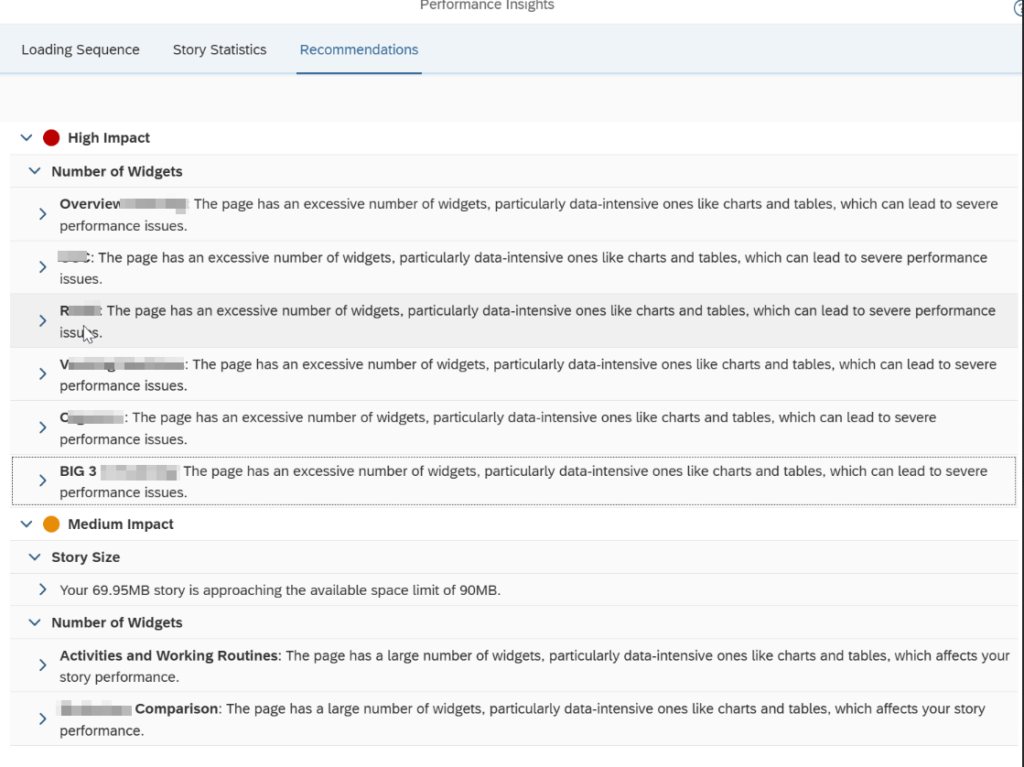 „Recommendations“ Tab shows recommendations for high impact and medium impact pages and their widgets as well as the Story Size (only if it has an impact on performance).
