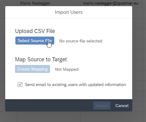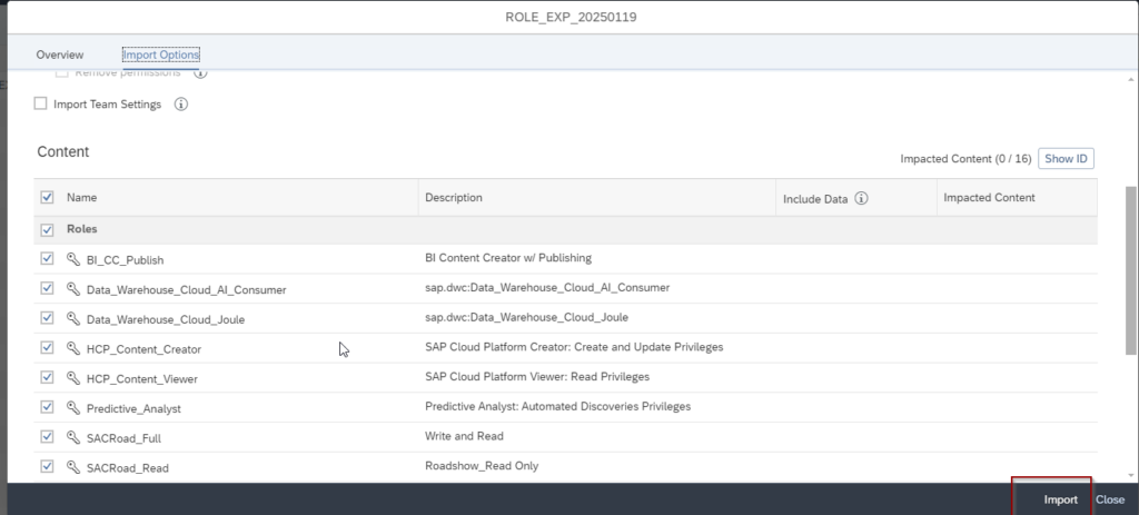 - If an error occurs because your user cannot be assigned a role, remove yourself from the export file and try again.