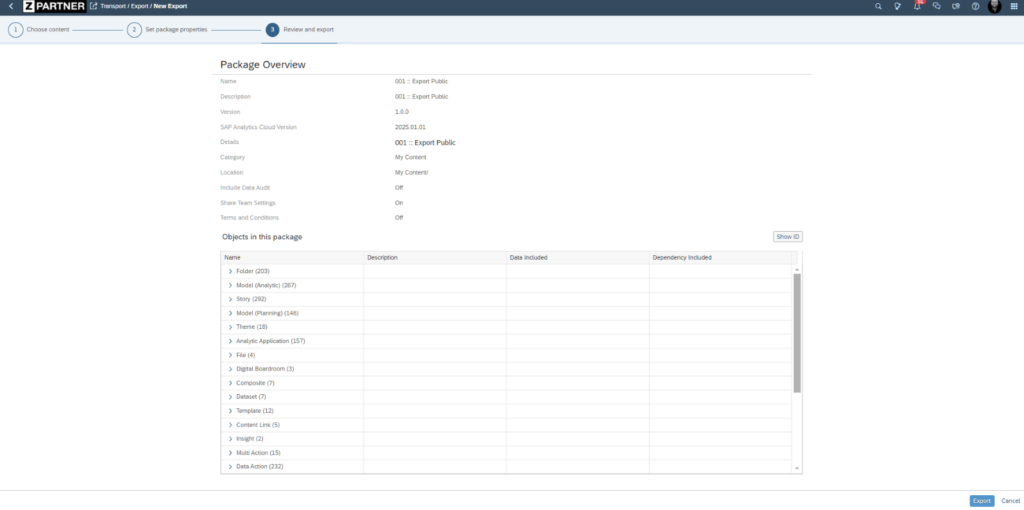 - The source and destination systems must be on the same or the following quarterly version of SAP Analytics Cloud. If the importing system is on an older version, the package will not appear. If it is two or more versions ahead of the exporting system, the package contents might not be supported.