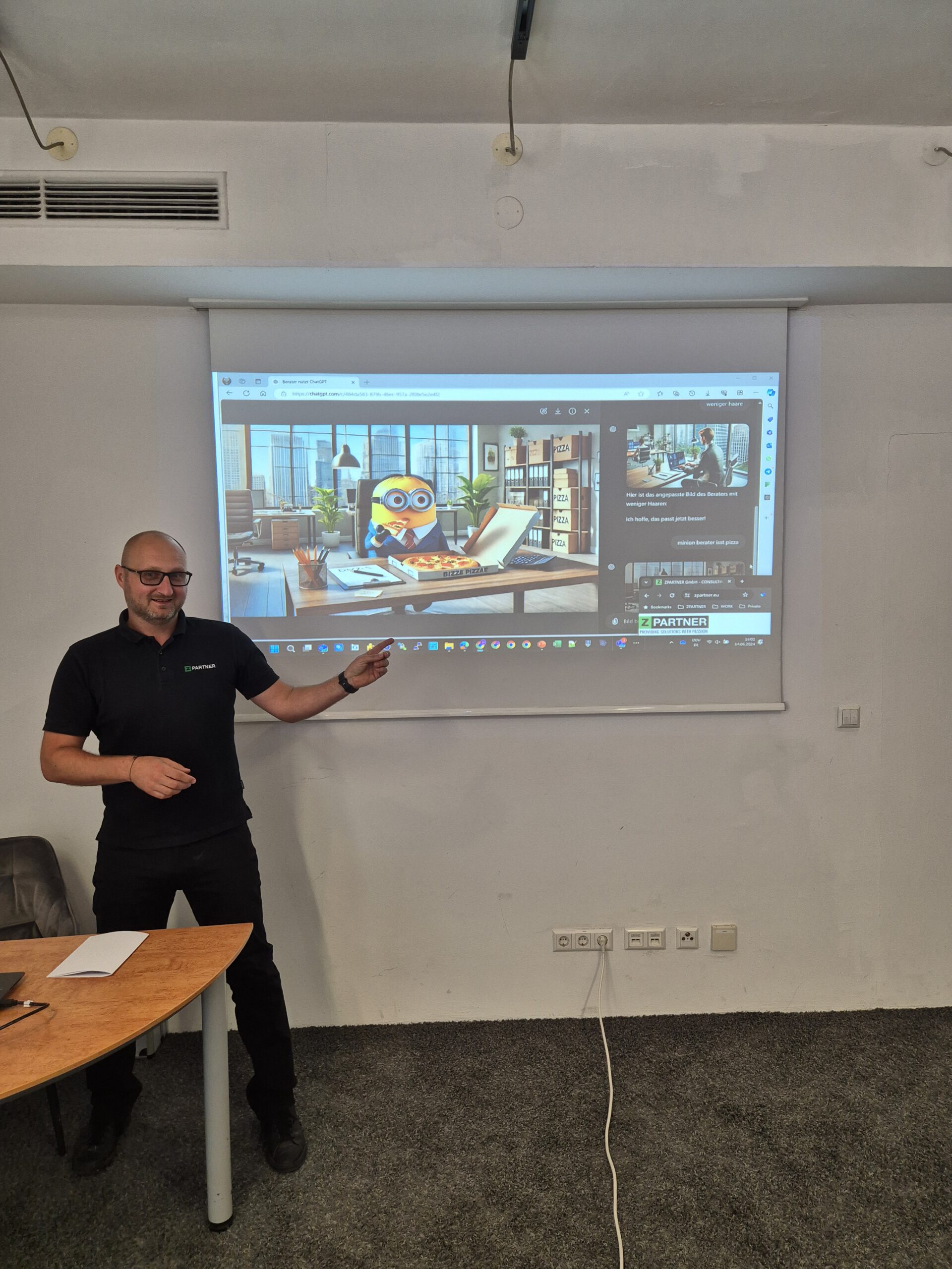 - Interne Diskussionen: In intensiven Gesprächen erkundeten unsere Teams, wie wir KI in den unterschiedlichsten Bereichen einsetzen können. Wir sprachen über die beeindruckenden Vorteile, wie die Steigerung der Effizienz und die Verbesserung der Entscheidungsfindung. Aber auch die Herausforderungen, insbesondere im Hinblick auf Datenschutz und ethische Fragen, wurden nicht außer Acht gelassen.