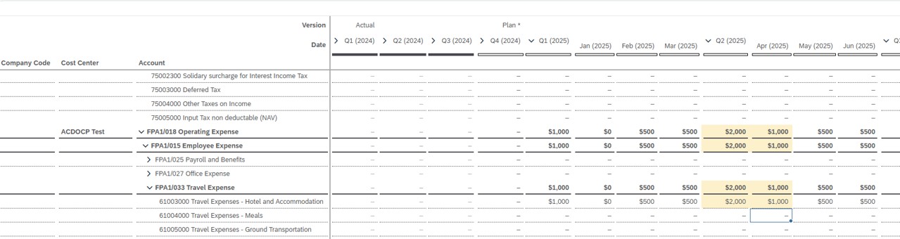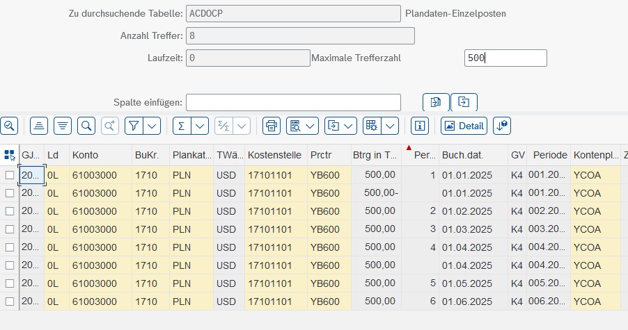 Here is an export example filtered for CostCentere “17101101”, FiscalYearPeriod “2025” and PlanningCategory “Plan” with this Dimensions in ExportScope: