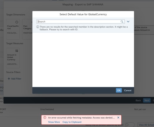 • “Access Denied” error for Master data: Activate missing OData Services for master data access. It can happen that you need to activate further OData services in S/4 to display S/4 master data in the data target selection. An error could look like this: