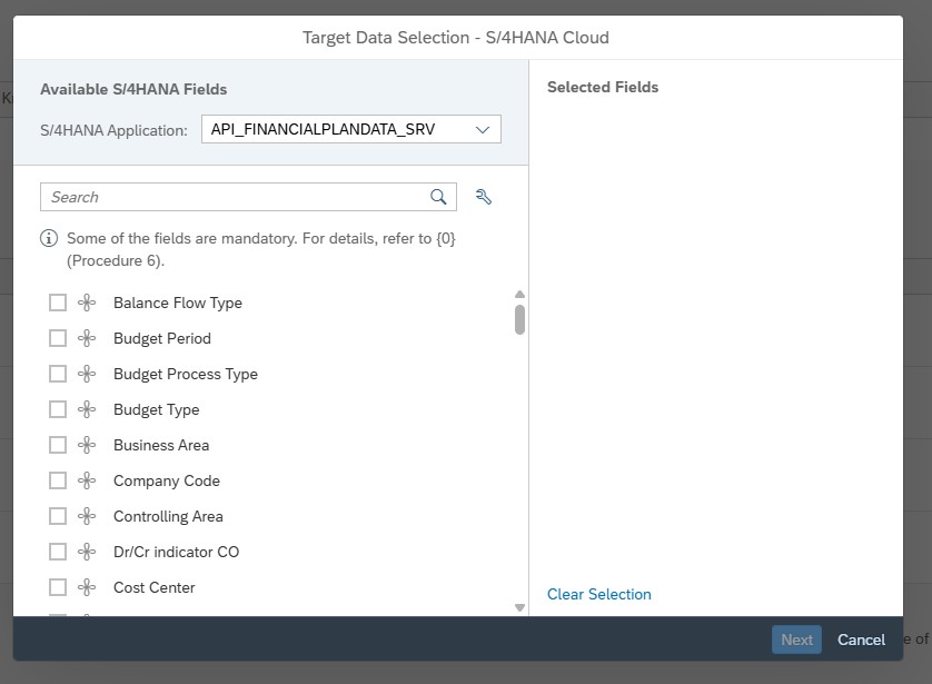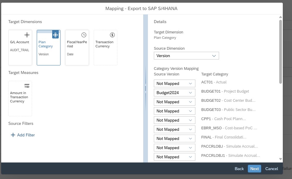 When choosing the target data in the “Target Data Selection” dialog, keep in mind that only valid combinations of dimension members will be exported. For instance, if you’re exporting a cost center to SAP S/4HANA, it must be linked to the company code included in the export. If it’s not, an error will occur, and you’ll need to download a file that provides details about the error (see also “Tips and Best Practices if you have problems or error messages with mapping dimensions).