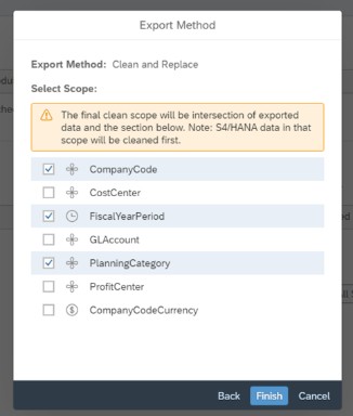 Finaly you need to define the export method. Here you can choose the dimensions that should be considered in the scope of the export. All members of the marked dimensions will be overwritten (if data is available). FiscalYearPeriod and PlanningCategory are mandatory here.