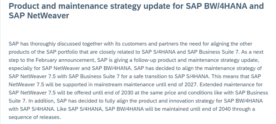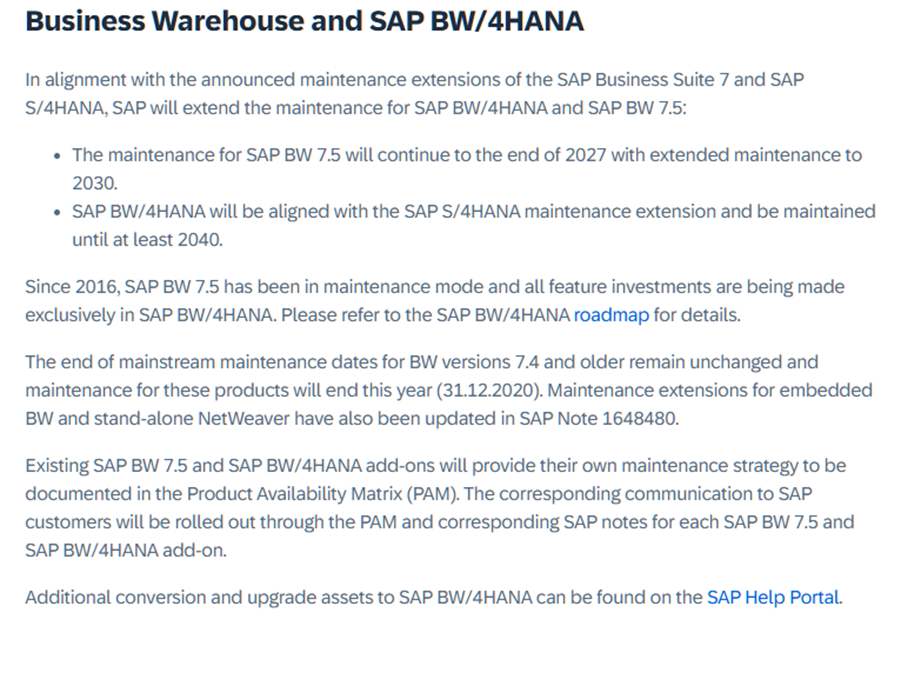 Die SAP BW4/HANA wird bis 2040 unterstützt und kann damit noch 15 Jahre weiter betreiben werden. Eine Migration eines SAP BW 750 System in SAP BW4/HANA würde die Wartung dementsprechend verlängern.