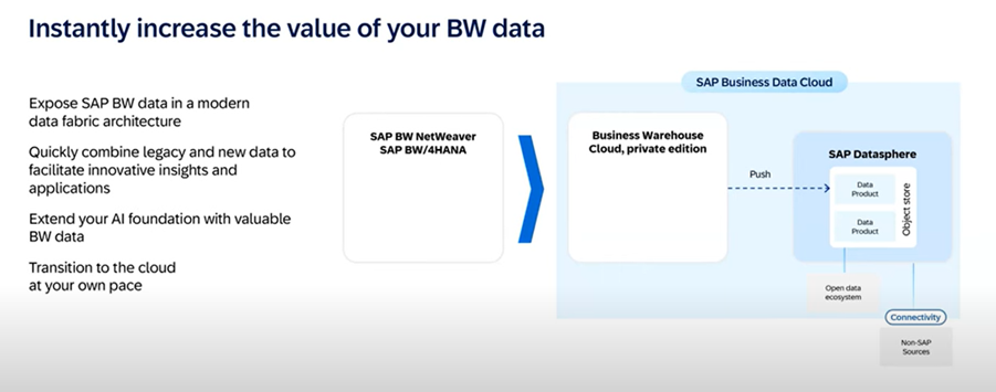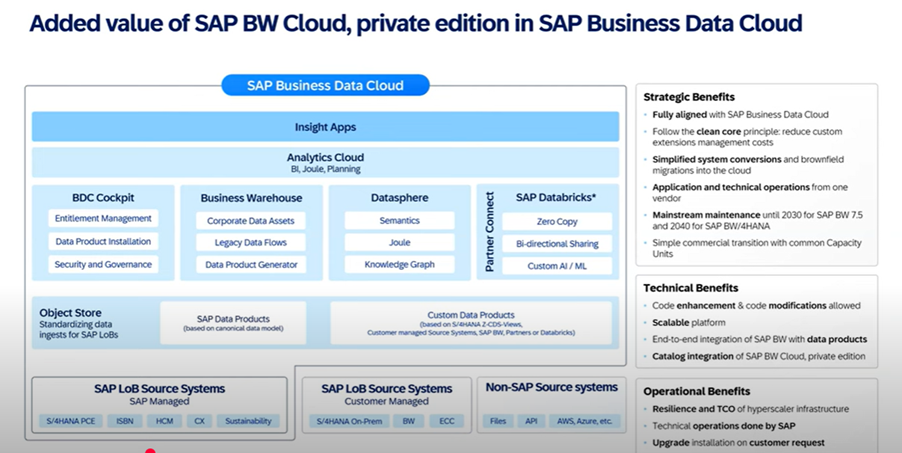 SAP bietet an ihre SAP BW 750 bzw. SAP BW4/HANA in die SAP Private Cloud Edition zu bringen und sie damit in die Cloud zu integrieren. Ihre Investments in die Daten und Systeme können damit die Vorteile der SAP Business Data Cloud (BDC) nutzen und in eine moderne Cloud-Landschaft integrieret werden.