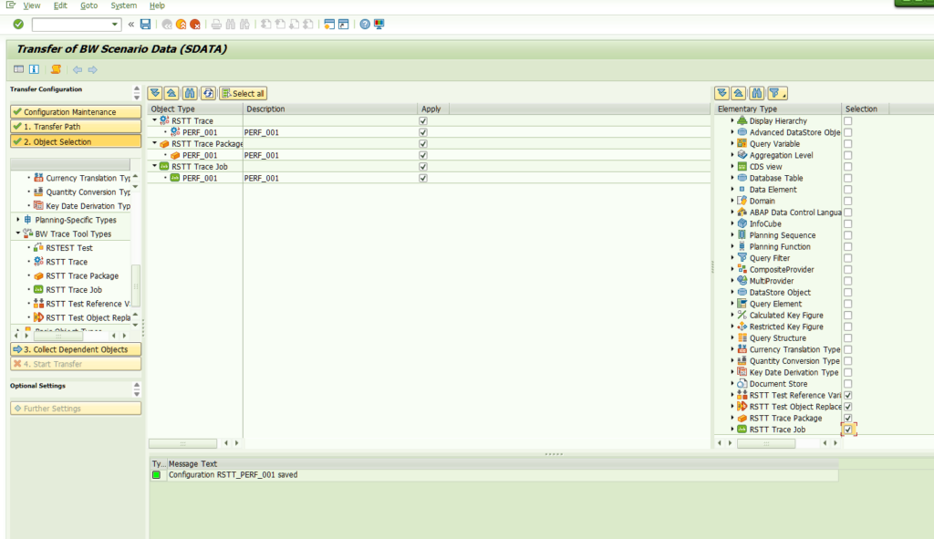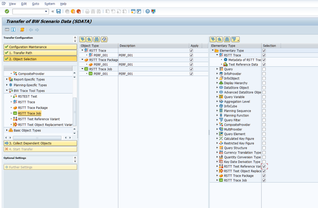 After selecting the package, proceed to collect the RSTT trace files. Within the export transfer, select the PERF_001 package and any associated CATT or job trace data that need to be transferred.